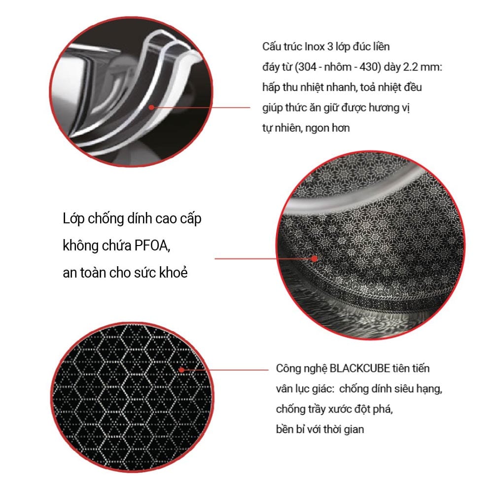 - Cấu trúc Inox 3 lớp đúc liền đáy từ (304-nhôm-430 ) dày 2.2 mm: hấp thu nhiệt nhanh – tỏa nhiệt đều giúp thức ăn giữ được hương vị tự nhiên, ngon hơn.
