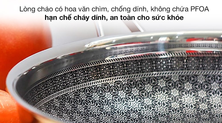 Mặt trong lòng chảo sở hữu hoa văn chìm, chống dính cao cấp không chứa PFOA, hạn chế cháy dính thực phẩm, an toàn cho sức khỏe