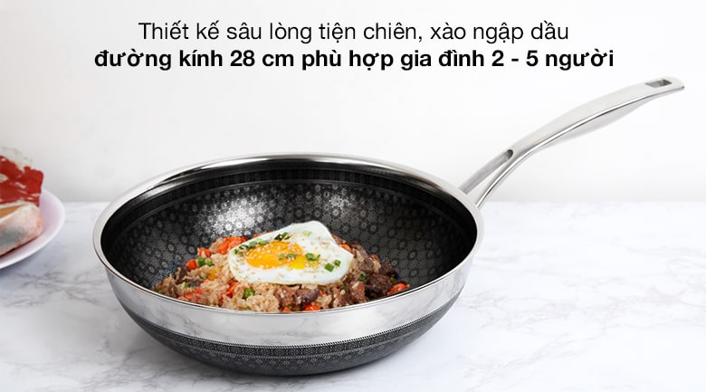 Đường kính 28cm cùng thiết kế sâu lòng tiện chiên ngập dầu con cá dưới 1.5 kg, xào lượng thức ăn đáp ứng nhu cầu 2 - 5 người