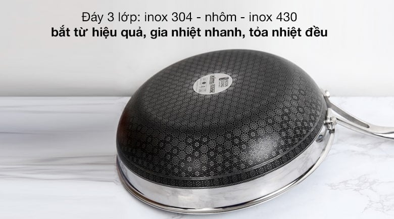 Đáy 3 lớp gồm inox 304 - nhôm - inox 430 giúp bắt từ hiệu quả, gia nhiệt nhanh, tỏa nhiệt đều