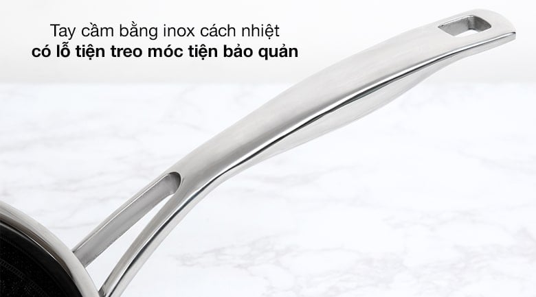 Tay cầm bằng inox cách nhiệt có lỗ tiện treo móc. Khối lượng 1.3 kg di chuyển chảo chắc tay