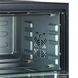 Hai bên hông lò có các dãy thông gió (những khía nhỏ bên hông) giúp thiết bị được làm mát và thoáng khí. Tay cầm được thiết kế phía trên cửa lò để phục vụ cho việc đóng mở cửa được thuận tiện, tránh bị bỏng khi lấy thức ăn.