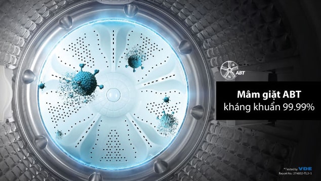 Mâm giặt của máy giặt Aqua làm từ chất liệu có khả năng kháng khuẩn đến 99.99% được phun vào mâm giặt, ngăn chặn sự phát triển của vi khuẩn và nấm mốc.