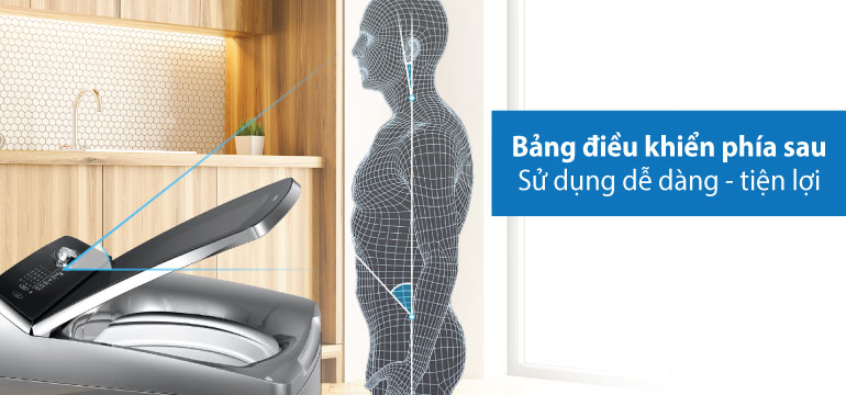Bảng điều khiển được thiết kế phía sau giúp cho việc điều khiển được dễ dàng và đặc biệt không bị dính nước sau mỗi lần giặt