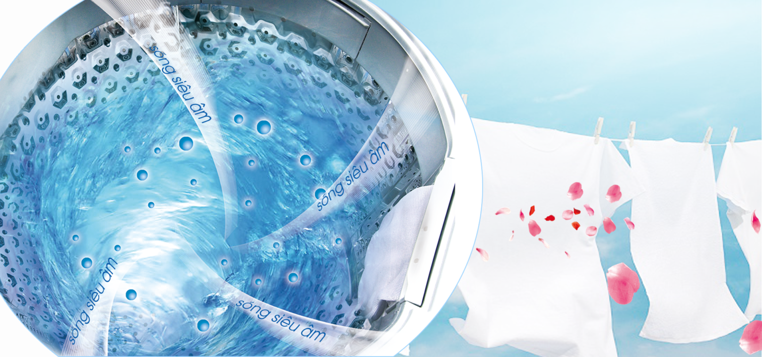 Công nghệ sóng siêu âm giúp bột giặt được hòa tan tốt hơn bằng các bọt khí được tạo ra trong quá trình giặt. Lực của những bọt khí vỡ ra kết hợp với sóng siêu âm làm bột giặt hòa tan đều và thấm sâu hơn vào từng sợi vải giúp hiệu quả giặt sạch tăng lên đáng kể. Các vết bẩn được đánh văng, ngay cả các vết cứng đầu nhất .