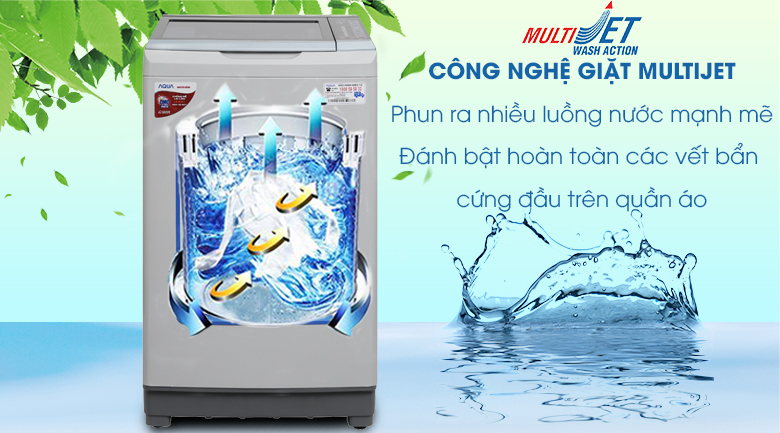 Công nghệ Multi Jet trên máy giặt Aqua có khả năng tạo ra luồng nước phun liên tục để mang đến hiệu quả giặt sạch vượt trội. Không chỉ có tạo điều kiện để hòa tan bột giặt tốt hơn, công nghệ này còn tạo ra áp lực nước tác động trực tiếp lên đồ giặt để đánh bật các vết bẩn cứng đầu và giảm xoắn rối hiệu quả.