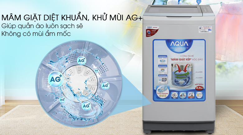Diệt khuẩn khử mùi Nano Ag+ của Máy giặt Aqua AQW-W80AT (H) sẽ sản sinh ra phân tử bạc trong quá trình vận hành, giúp khử trùng nước giặt và đẩy lùi mùi hôi khó chịu, chăm sóc tốt hơn cho sợi vải, bảo vệ làn da nhạy cảm của trẻ nhỏ.