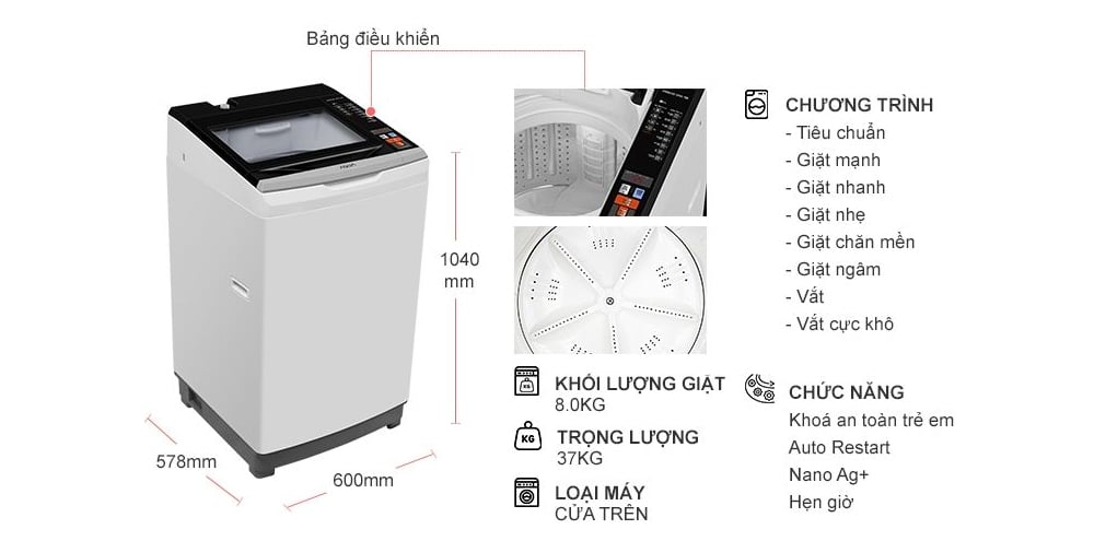 Máy giặt Aqua 8 kg AQW-S80AT thiết kế nhỏ gọn cho model cửa trên, màu xám, công nghệ sơn tĩnh điện. Khối lượng 8kg phù hợp gia đình 3 - 4 thành viên. Tự động khởi động khi có điện trở lại.