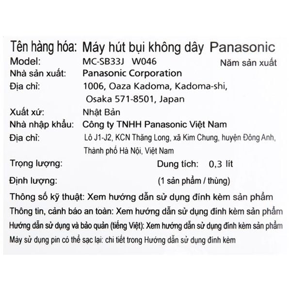 Panasonic đã trang bị cho dòng máy hút bụi không dây MC-SB33JW046 của hãng Pin lithium-ion có thể sạc lại. Thời gian hoạt động liên tục là 6 phút - 30 phút, thời gian sạc lại khoảng 3.5 giờ.