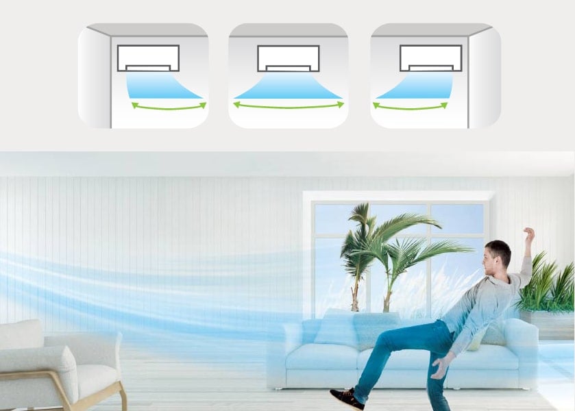 Với máy lạnh Mitsubishi Heavy bạn có thể điều chỉnh hướng gió thổi trái/phải bằng bộ điều khiển từ xa tùy theo vị trí lắp đặt của máy để tối đa hóa việc điều hòa nhiệt độ.