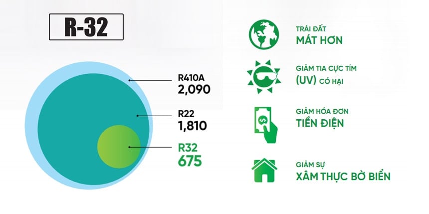 Gas R32 là loại gas mới nhất hiện nay, đạt được tiêu chuẩn khí thải GWP thấp, giúp giảm lượng khí thải lên đến 75%, đáp ứng được yêu cầu bảo vệ môi trường, chống được sự gia tăng nhiệt dẫn đến hiệu ứng nhà kính làm thủng tầng ozon.