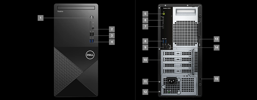 Vostro 3020T Desktop được trang bị nhiều cổng kết nối, bao gồm cổng HDMI 1.4b, Display Port, USB 2.0 và USB 3.2 Gen 1, đảm bảo bạn có thể kết nối với các thiết bị ngoại vi một cách dễ dàng.