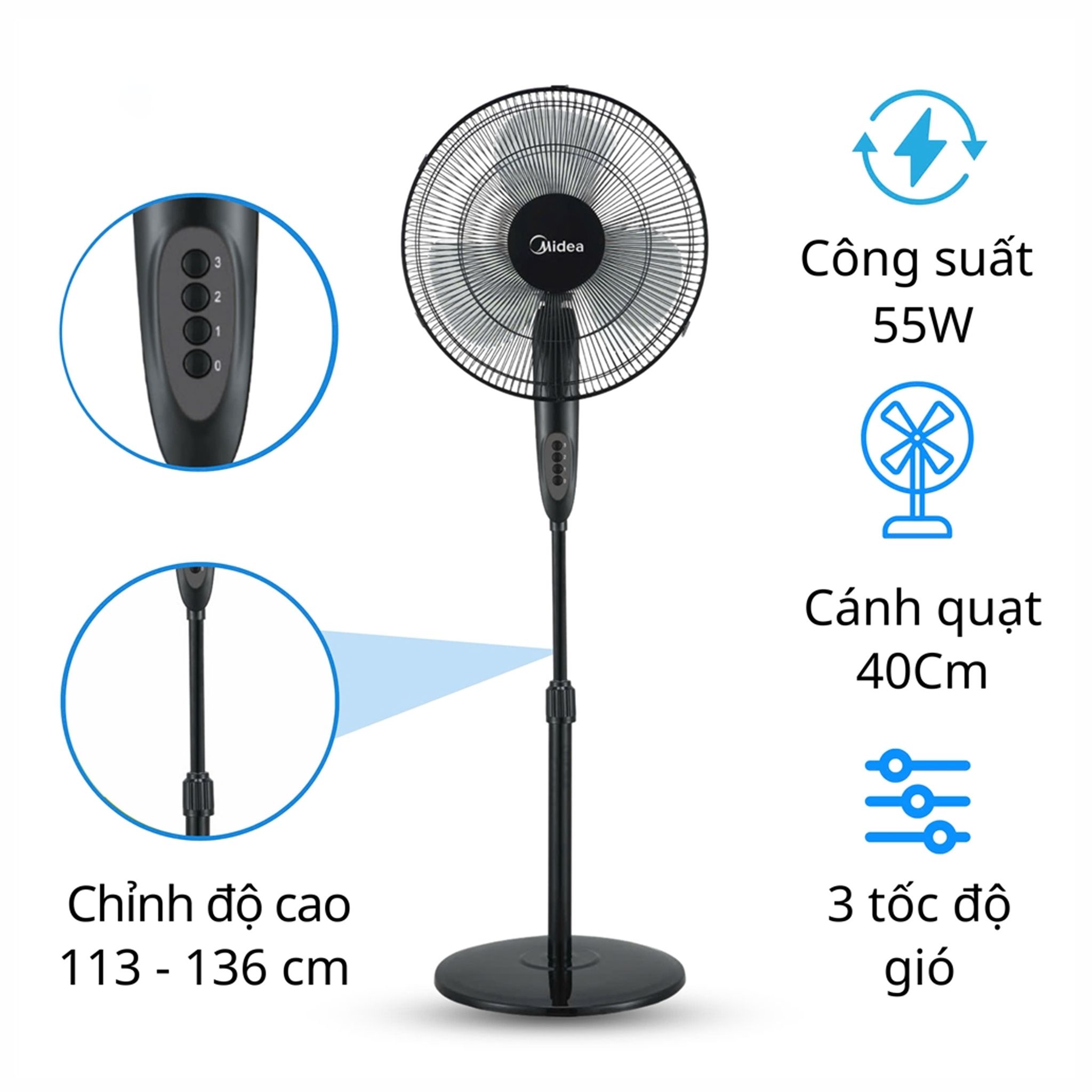 * Chiều cao quạt có thể điều chỉnh linh hoạt.