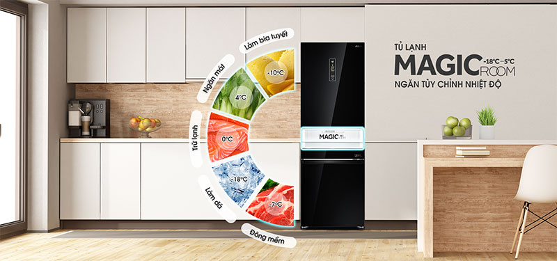 Ngăn Magic Room được thiết kế hoàn toàn kín và riêng biệt với ngăn mát, giúp ngăn này dễ dàng đạt được nhiệt độ cài đặt mà không ảnh hưởng đến nhiệt độ ngăn mát. Khoang chứa lớn giúp lưu trữ thực phẩm dễ dàng.