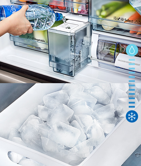 Đá viên được làm tự động và liên tục bằng cách chỉ cần đổ đầy nước vào hộc nước . Khi bạn muốn làm đá nhanh, hãy BẬT chế độ Làm đông nhanh. Thao tác này sẽ làm đá nhanh hơn khoảng 24%.