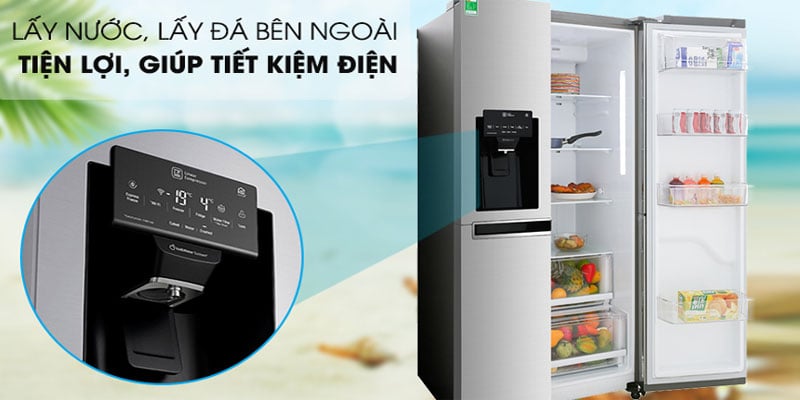 Tủ lạnh LG GR-D247JDS với hệ thống lấy nước và lấy đá ngoài giúp bạn nhanh chong có được ly nước mát lạnh và những viên đá tinh khiết. Việc lấy nước và đá ngoài giúp bạn tiết kiệm đáng kể tiền điện do việc hạn chế thất thoát hơi lạnh khi mở cửa.