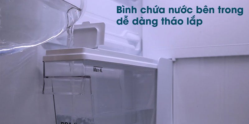 Bình chứa nước cho khay lấy nước ngoài được trang bị bên trong tủ với thiết kế chất liệu nhựa an toàn và dung tích lên đến 4 lít giúp nên người dùng không cần thêm nước thường xuyên khi dùng. Và nhờ thiết kế riêng biệt nên tháo lắp dễ dàng để vệ sinh.