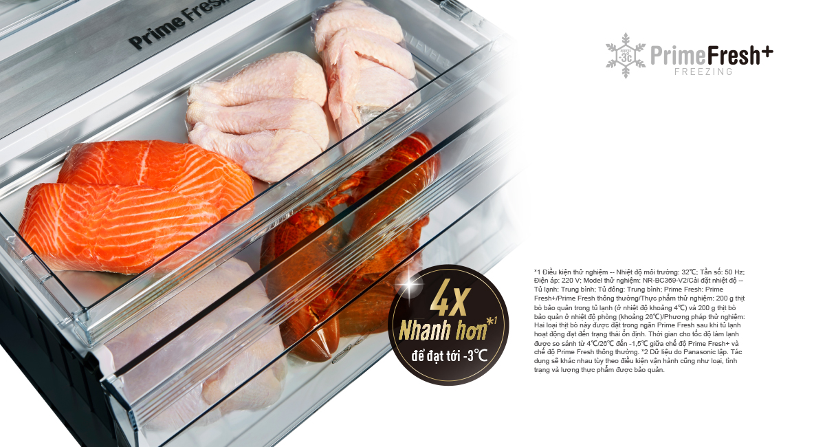 Công nghệ Prime Fresh cấp đông mềm cho thịt cá ở nhiệt độ khoảng -3°C. Thực phẩm được cấp đông mềm bằng công nghệ này giữ được độ tươi ngon trong khoảng 7 ngày mà không cần rã đông. Chọn chế độ Prime Fresh+ để bảo quản thực phẩm tươi ngon bằng cách cấp đông mềm ở -3°C nhanh hơn gấp bốn lần.