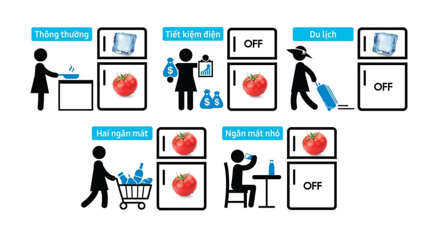 Với công nghệ 2 dàn lạnh độc lập duy nhất chỉ có tủ lạnh Samsung cho phép người dùng linh hoạt sử dụng một trong 5 chế độ tùy theo nhu cầu. Chuyển đổi ngăn đông thành ngăn mát thêm không gian lưu trữ (chế độ Hai ngăn mát) hoặc tắt hẳn một trong hai ngăn để tiết kiệm điện năng khi không có nhu cầu sử dụng (chế độ Tiết kiệm điện, Du lịch, Ngăn mát nhỏ).