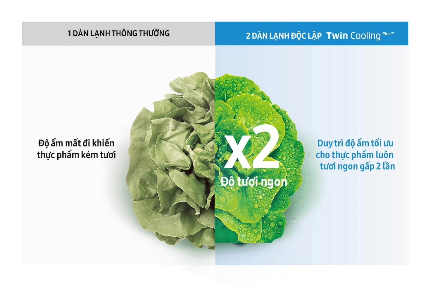 Nhờ hai dàn lạnh hoạt động độc lập, hai ngăn tủ của tủ lạnh Twin Cooling Plus hoàn toàn tách biệt, ngăn việc mất độ ẩm từ ngăn mát sang ngăn đông do sự trao đổi khí giữa hai ngăn, giữ độ ấm tối ưu, giúp thực phẩm tươi ngon lâu hơn gấp 2 lần.