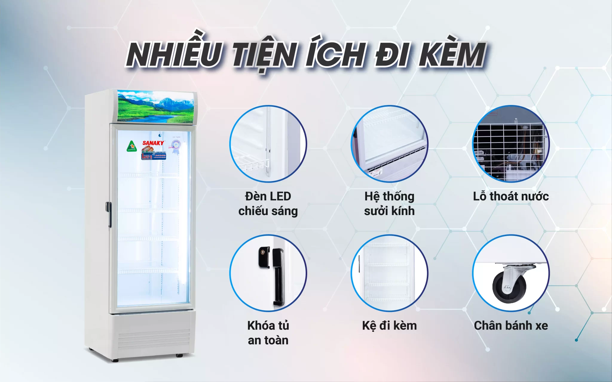 Đèn LED: Tủ mát Sanaky được thiết kế với hệ thống đèn LED dọc theo hông và nóc tủ, chiếu sáng toàn bộ các góc khuất giúp trưng bày các sản phẩm bắt mắt và thu hút. Hơn nữa, hệ thống đèn LED còn tiết kiệm điện năng và có tuổi thọ bền bỉ hơn nhiều lần so với các loại đèn huỳnh quang, đèn sợi đốt,… mang lại giá trị sử dụng lâu dài cho người sử dụng.